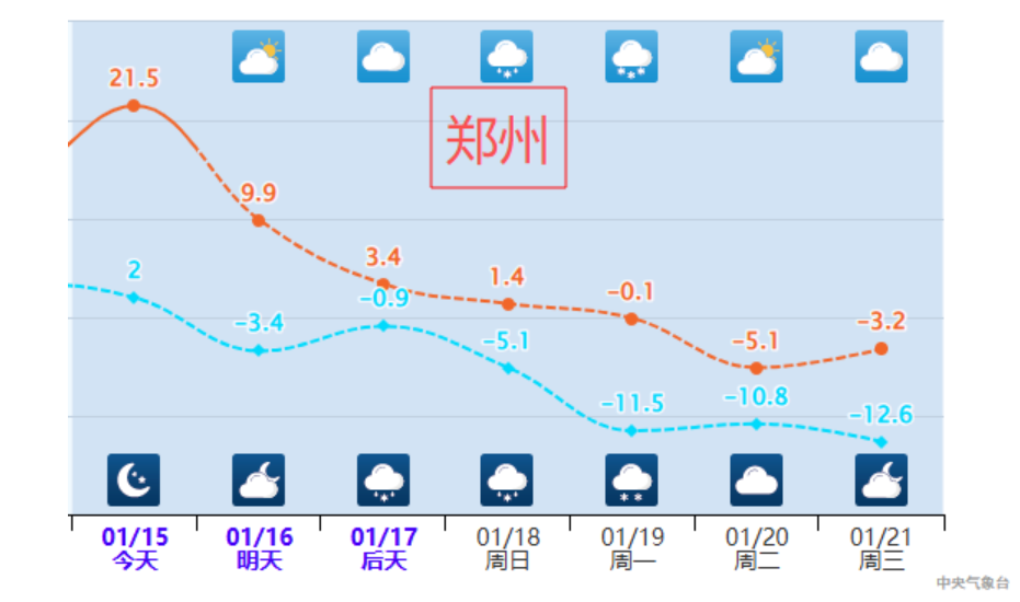 大城市中,郑州今天还在享受21℃的“春日”暖阳,明起气温开始持续走下坡路,到周日最高气温只剩0℃出头,下周初更是直接冻到-5℃,过程累计降温幅度超25℃。