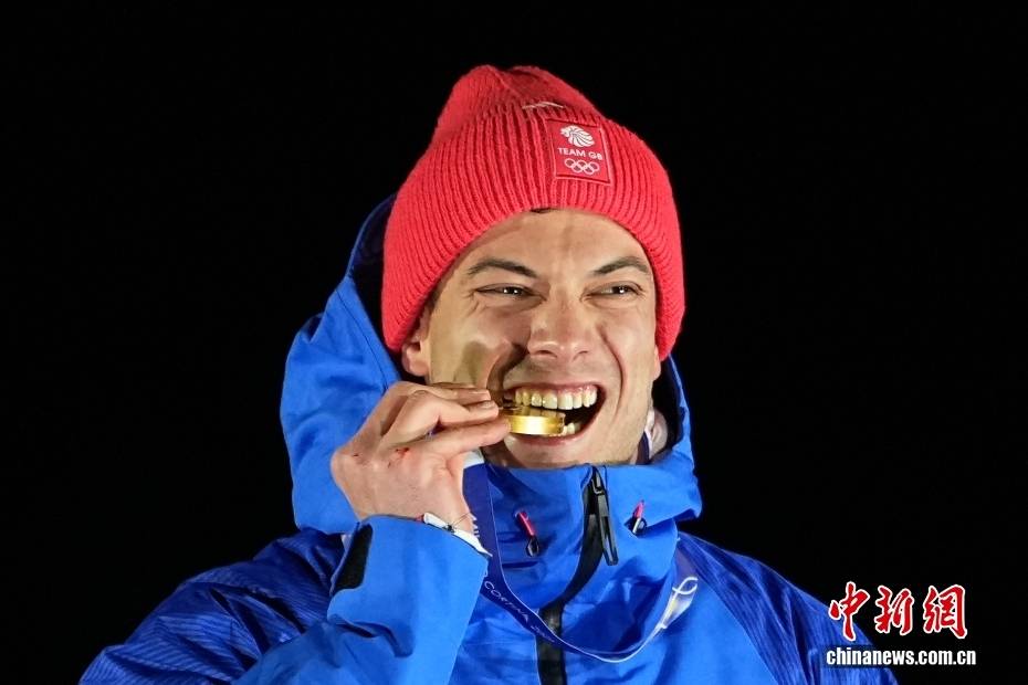 当地时间2月13日晚,2026年米兰-科尔蒂纳冬奥会男子钢架雪车比赛在科尔蒂纳滑行中心继续进行。英国选手马特·韦斯顿延续统治,在该项目四轮滑行中四次刷新赛道纪录,最终以总成绩3分43秒33夺冠。图为马特·韦斯顿在颁奖仪式上“品尝”金牌。中新社记者 崔楠 摄