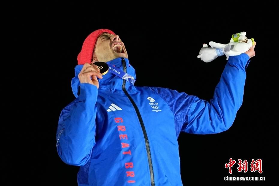 当地时间2月13日晚,2026年米兰-科尔蒂纳冬奥会男子钢架雪车比赛在科尔蒂纳滑行中心继续进行。英国选手马特·韦斯顿延续统治,在该项目四轮滑行中四次刷新赛道纪录,最终以总成绩3分43秒33夺冠。图为马特·韦斯顿在颁奖仪式上仰天庆祝。中新社记者 崔楠 摄