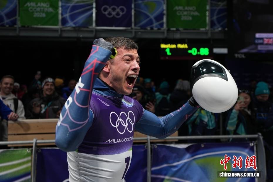 当地时间2月13日晚,2026年米兰-科尔蒂纳冬奥会男子钢架雪车比赛在科尔蒂纳滑行中心继续进行。英国选手马特·韦斯顿延续统治,在该项目四轮滑行中四次刷新赛道纪录,最终以总成绩3分43秒33夺冠。图为马特·韦斯顿在赛后激动庆祝夺冠。中新社记者 崔楠 摄