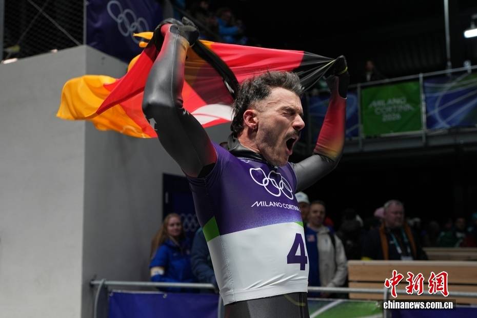 当地时间2月13日晚,2026年米兰-科尔蒂纳冬奥会男子钢架雪车比赛在科尔蒂纳滑行中心继续进行。北京冬奥会亚军、德国选手阿克塞尔·容克以3分44秒21的总成绩摘银。图为阿克塞尔·容克庆祝完成比赛。中新社记者 崔楠 摄