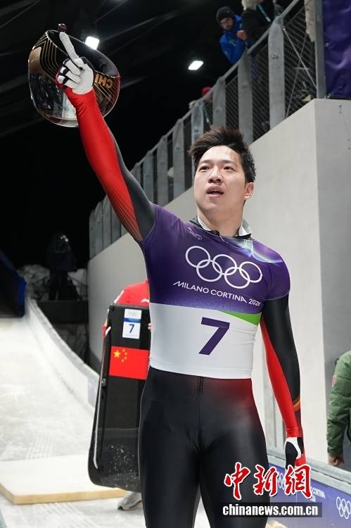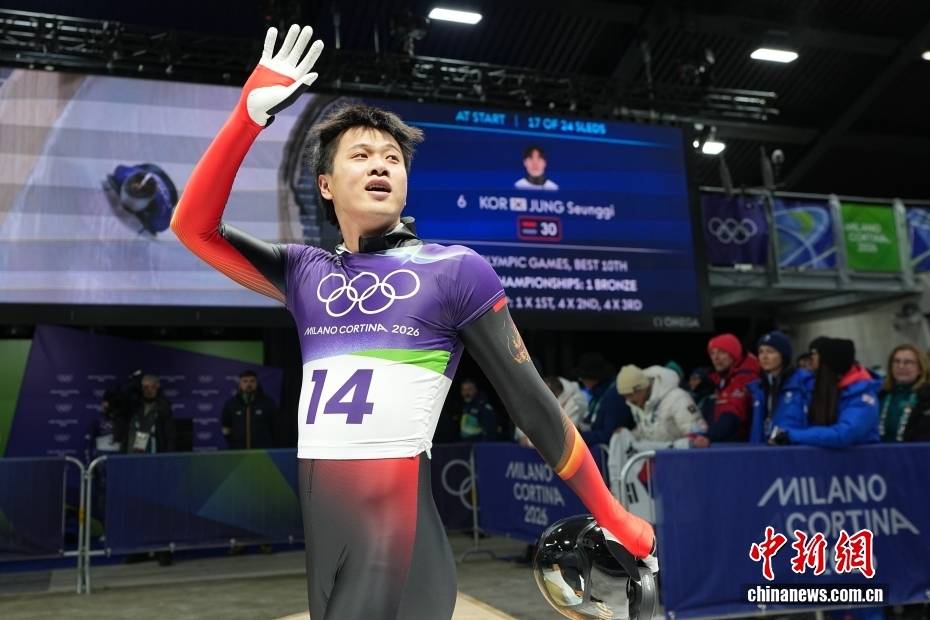 当地时间2月13日晚,2026年米兰-科尔蒂纳冬奥会男子钢架雪车比赛在科尔蒂纳滑行中心继续进行。中国队选手殷正最终以总成绩3分45秒55名列第7。图为殷正在赛后向观众致意。中新社记者 崔楠 摄
