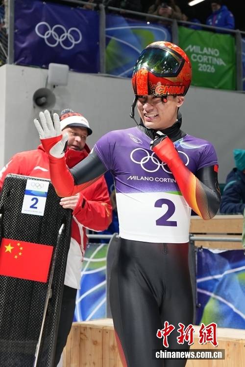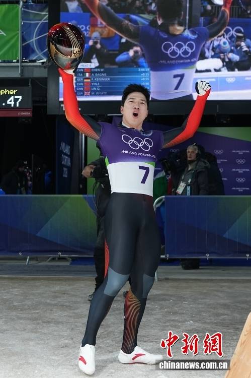 当地时间2月13日晚,2026年米兰-科尔蒂纳冬奥会男子钢架雪车比赛在科尔蒂纳滑行中心继续进行。中国队选手陈文浩最终以总成绩3分44秒59名列第4,以0.19秒之差与奖牌擦身而过。图为陈文浩在赛后庆祝完赛。中新社记者 崔楠 摄