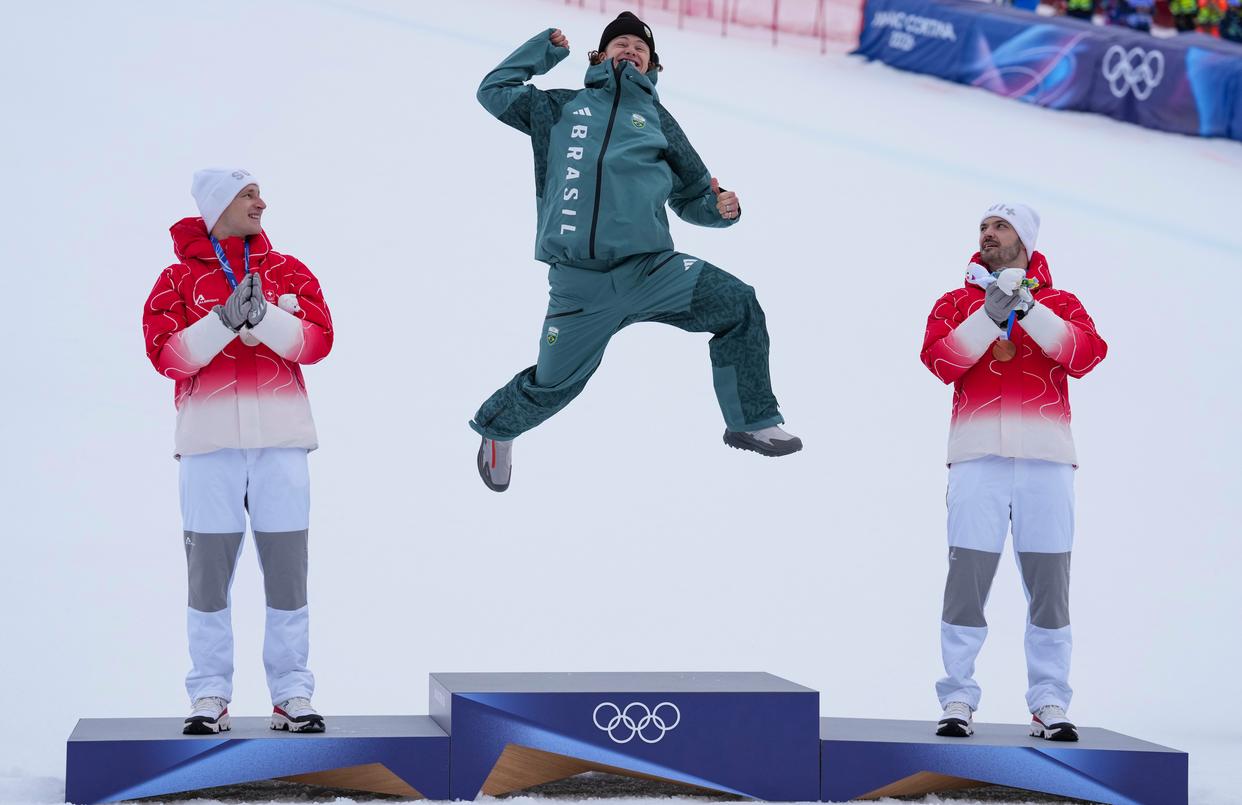 2月14日,冠军巴西选手卢卡斯·布罗滕(中)、亚军瑞士选手马尔科·奥德尔马特(左)、季军瑞士选手路易克·梅拉尔在颁奖仪式上。当地时间2月14日,米兰-科尔蒂纳冬奥会高山滑雪男子大回转比赛在意大利博尔米奥举行。新华社记者 胡虎虎 摄