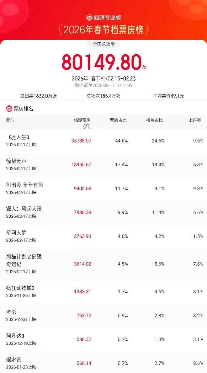据猫眼专业版数据,2026年春节档档期总票房破8亿,《飞驰人生3》持续领跑。 (猫眼专业版)