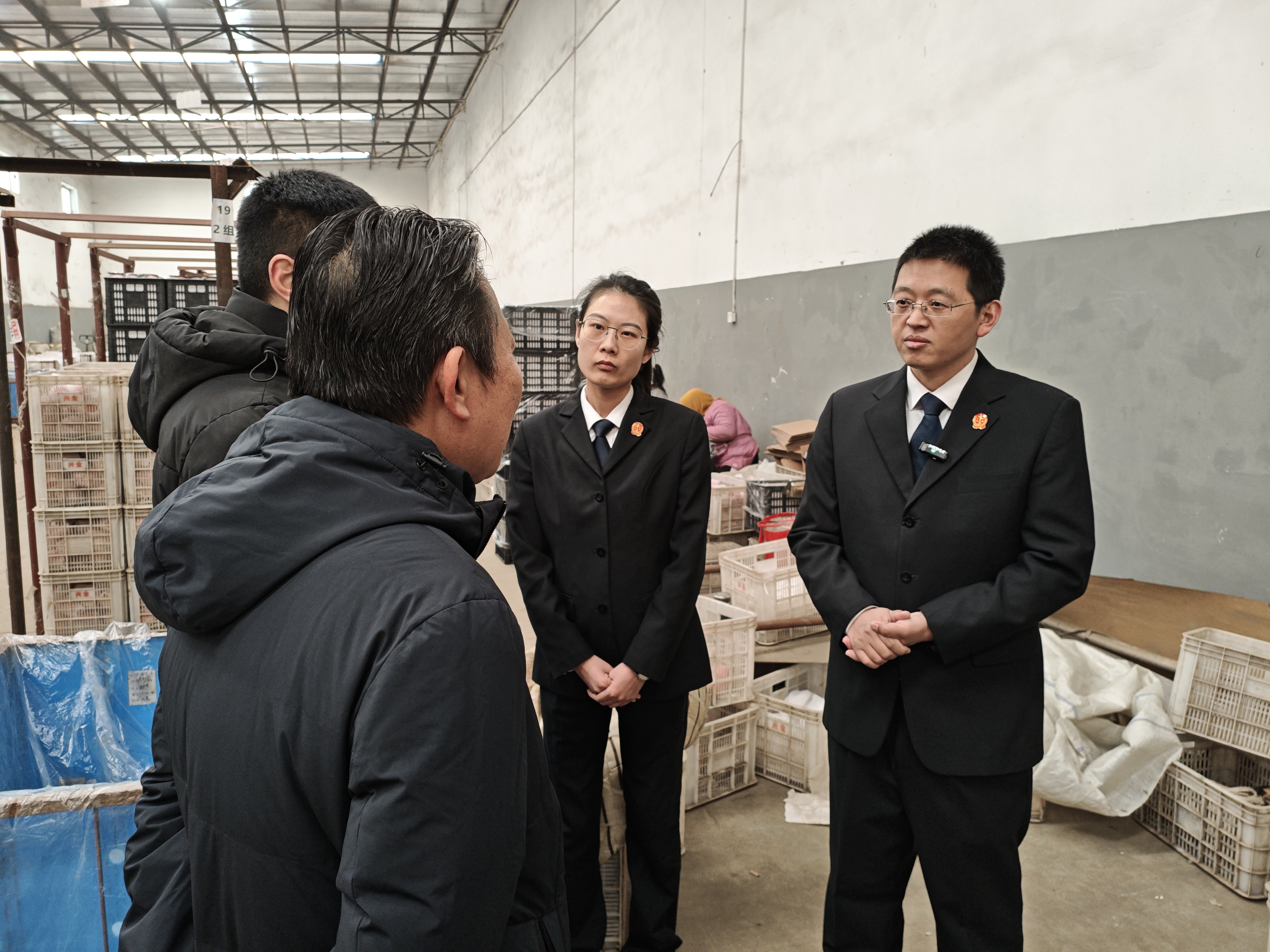 2月10日,金良(右一)和于意法官(右二)到桃村一家冷库调解一起苹果买卖纠纷