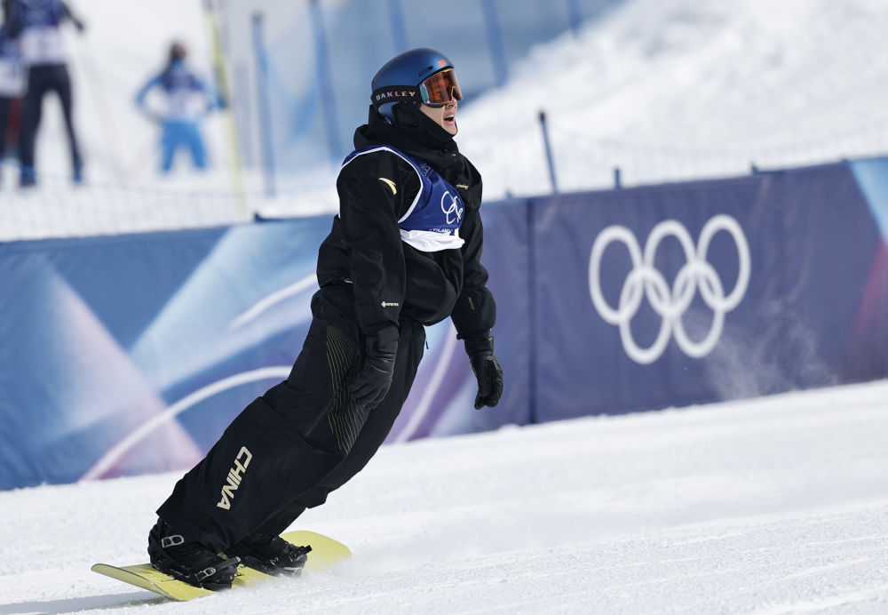新华社意大利利维尼奥2月18日电 在刚刚结束的米兰冬奥会单板滑雪男子坡面障碍技巧决赛中,中国选手苏翊鸣发挥出色夺得冠军,为中国代表团赢得本届冬奥会首枚金牌。 2月18日,中国选手苏翊鸣在比赛中。新华社记者 王鹏 摄